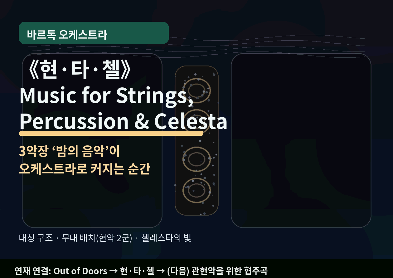 핵심 요약바르톡의 은 1943년 8/15-10/8 사이에 작곡되었고, 쿠세비츠키 재단(Koussevitzky Foundation)의 위촉으로 탄생했습니다.초연은 1944년 12월 1일, 보스턴 심포니 홀에서 보스턴 심포니 오케스트라(지휘: 세르게이 쿠세비츠키)가 맡았고 대성공을 거두었습니다.5악장 중 2악장 "Game of Pairs(짝의 놀이)", 4악장 "Intermezzo interrotto(중단된 간주곡)"이 많은 사랑을 받는 곡이고, 3악장은 '밤의 음악' 계열의 분위기를 확장해 들을 수 있습니다.목차1. 왜 제목이 '협주곡'일까: 오케스트라가 솔로가 된다2. 탄생 이야기: 병원, 위촉, 그리고 1943년의 집중3. 전체 구조: 5악장을 '점점 밝아지는 드라마'로 읽기4. 1악장: 어둠 속에서 ..